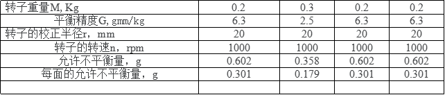 2)舉例如下:如果一個(gè)電機(jī)轉(zhuǎn)子的平衡精度要求為G6.3級,轉(zhuǎn)子的重量為0.2kg,轉(zhuǎn)子的轉(zhuǎn)速未為1000rpm,校正半徑20mm,